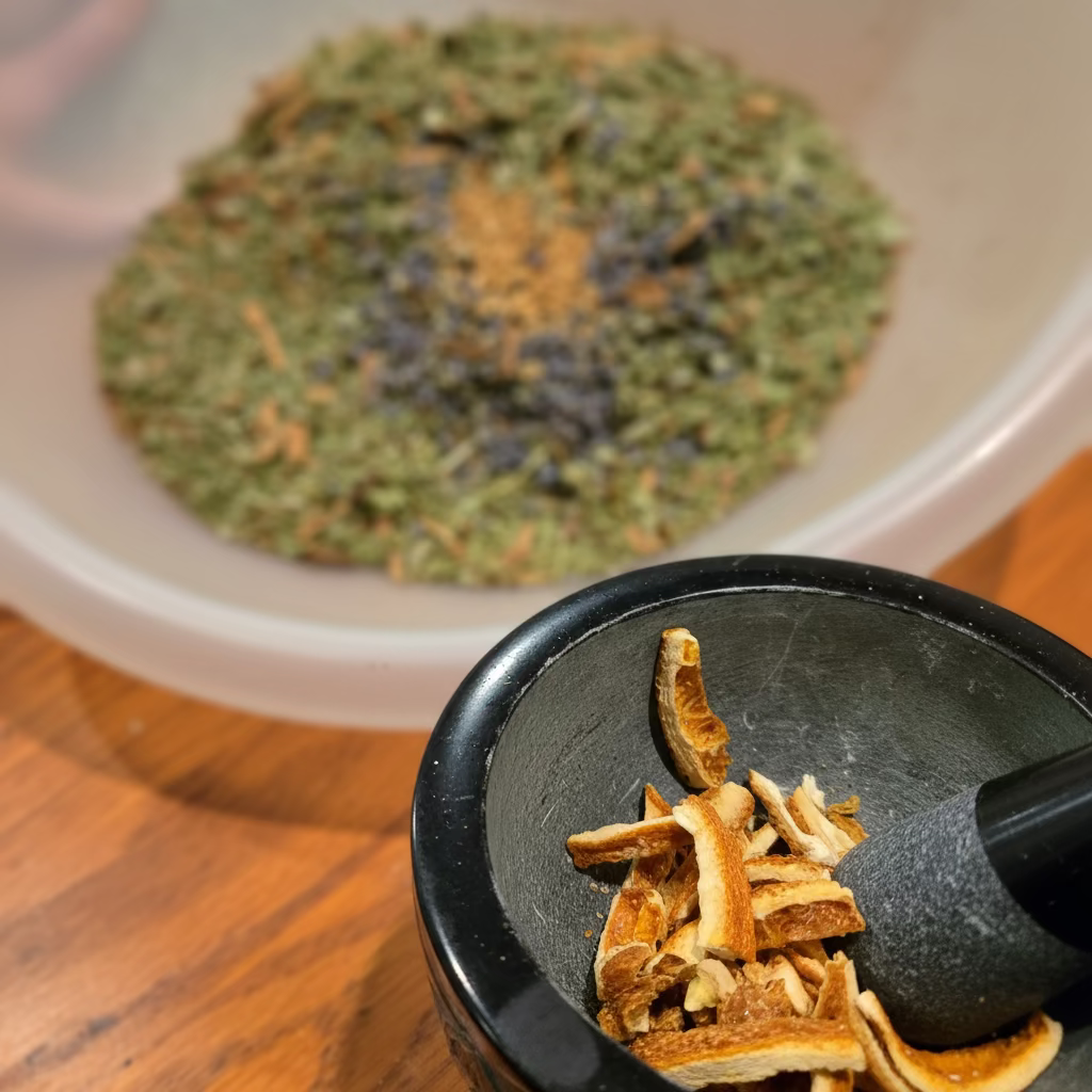 Crafted to create a rich, comforting smoke for ritual protection and sacred space work. This blend weaves evergreen notes with soft herbs and gentle spice, evoking the warmth of a hearth fire and the safety of home. Ideal for grounding, warding, and creating a calm, protected atmosphere. Rosemary, Sage, Pine, Cinnamon, Clove, Lavender, and Orange Peel.
